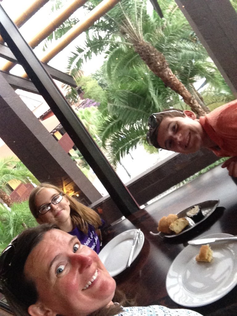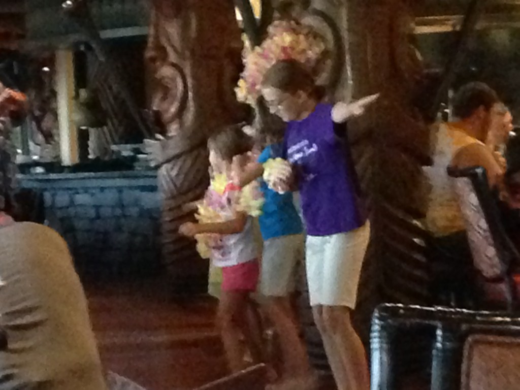 The dinner is served family style and is all you care to eat. They start by the hostess grabbing some pineapple-cocunut bread and taking you to your table. Be sure to not get filled up on this bread because you wont want to miss what comes next. For starters, you get a mixed greens salad with Likikoi dressing, Pork Dumplings, honey-coriander chicken wings, Teriyaki noodles, and stir-fried vegetables. Then the waiter comes around with 3 foot skewers of chicken, steak and shrimp which are slid off onto your plate as many times as you would like. The dessert is the famous ‘Ohana bread pudding ‘a la mode. They will also bring out something different for the kids which could be a bowl of ice cream or some Mickey shaped sprinkled rice krispy treats. If you have a picky eater or a vegetarian in your group, just let your server know and he/she will grab them something special from the kitchen. (My youngest daughter is very picky and always asks for mac and cheese. This is actually really good. My dad and I always have a little serving of it, too!) If you want more of anything, they will bring it to you!